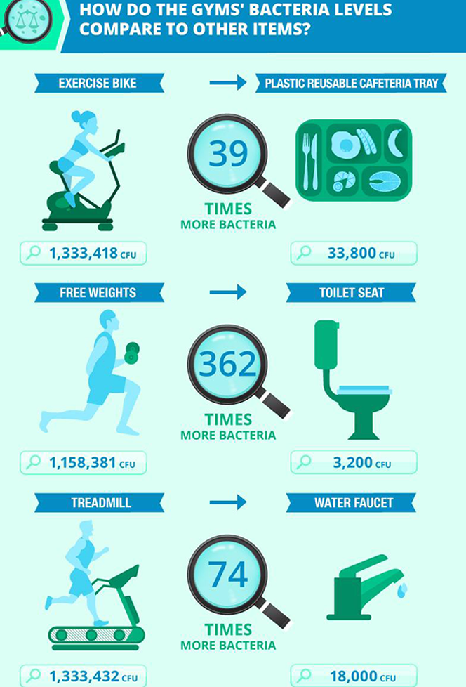 Des bacillus, responsables d’infections respiratoires se logent également sur les vélos et les haltères.